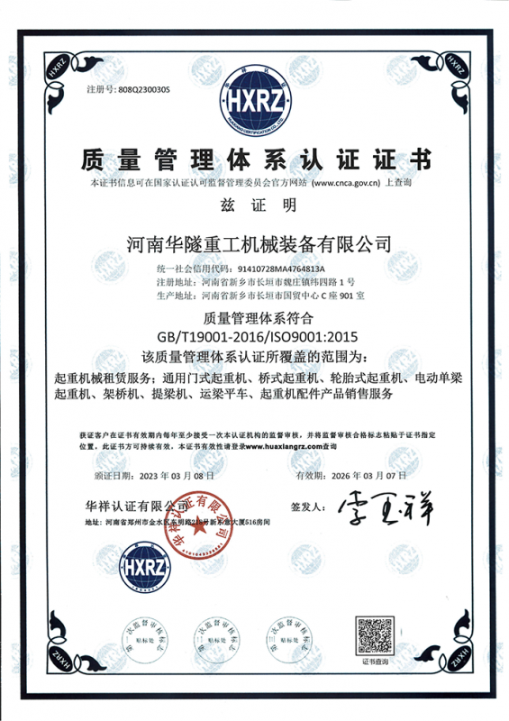 河南華隧重工機(jī)械裝備有限公司主要從事通用門(mén)式起重機(jī)、橋式起重機(jī)、電動(dòng)單梁起重機(jī),輪胎式起重機(jī)、架橋機(jī)、提梁機(jī)、遠(yuǎn)梁平車(chē)、鋼絲繩電動(dòng)萌蘆、卷?yè)P(yáng)機(jī)、起重配件制造、銷(xiāo)售:起重機(jī)械租賃、安裝和維修,起重設(shè)備園收,機(jī)械設(shè)備維修,鋼結(jié)構(gòu)工程承包,橋梁工程及技術(shù)咨淘服務(wù),銷(xiāo)售五金制品、機(jī)電設(shè)備:建設(shè)工程監(jiān)理,建設(shè)工程設(shè)計(jì),各類(lèi)工程建設(shè)活動(dòng),建筑勞務(wù)分包,建筑物折除作業(yè),施工作業(yè),工程管理服務(wù),土石方工程施工,裝如發(fā)運(yùn)。  公司已通過(guò)IS0國(guó)際質(zhì)量、環(huán)境、健康與安全三合一標(biāo)準(zhǔn)認(rèn)證,特種設(shè)備制造許可證和特種設(shè)備安裝改造維修許可證。擁有完熟的質(zhì)量管理體系。嚴(yán)格的管理制度,強(qiáng)大的生產(chǎn)能力和先進(jìn)的檢測(cè)手段,在保證產(chǎn)品質(zhì)量的同時(shí),也具備了極強(qiáng)的市場(chǎng)競(jìng)爭(zhēng)力。  公司堅(jiān)持科技創(chuàng)新為理念,產(chǎn)品質(zhì)量為核心,注重信譽(yù),建立了減信可靠、快捷、思速。便利周到的售后服務(wù)網(wǎng)絡(luò)。  我們擁有的技術(shù)專(zhuān)家和技術(shù)服務(wù)隊(duì)伍為客戶(hù)提供充善的售前技術(shù)支持和全天候的售后服務(wù)體系,讓您無(wú)后顧之憂(yōu),享受一站式的超值服務(wù)。  “華隧重工,伴您成功“是華隧重工永遠(yuǎn)的宗指,真被的希望與各界朋友攜手并進(jìn)。共創(chuàng)輝準(zhǔn)!